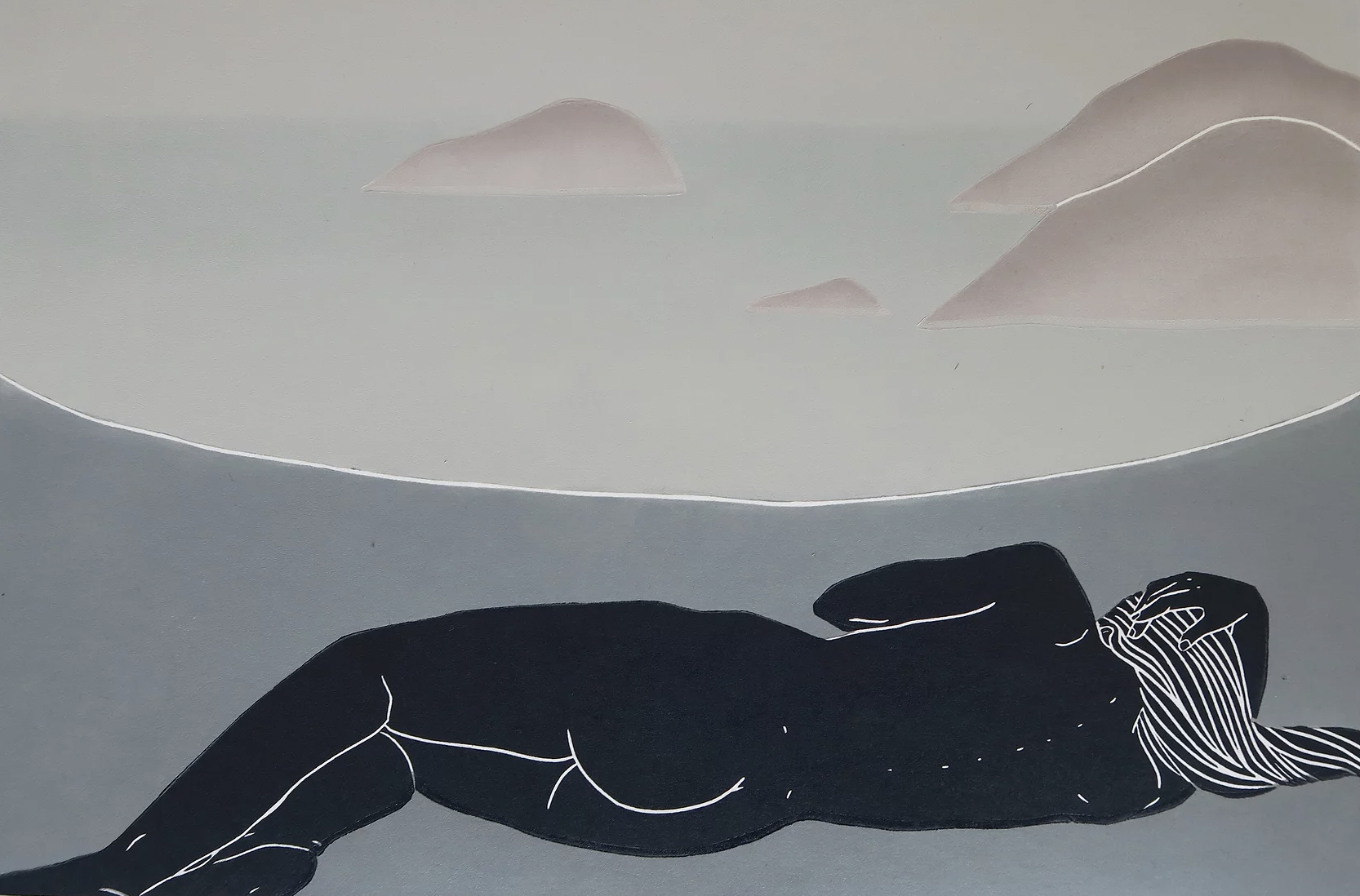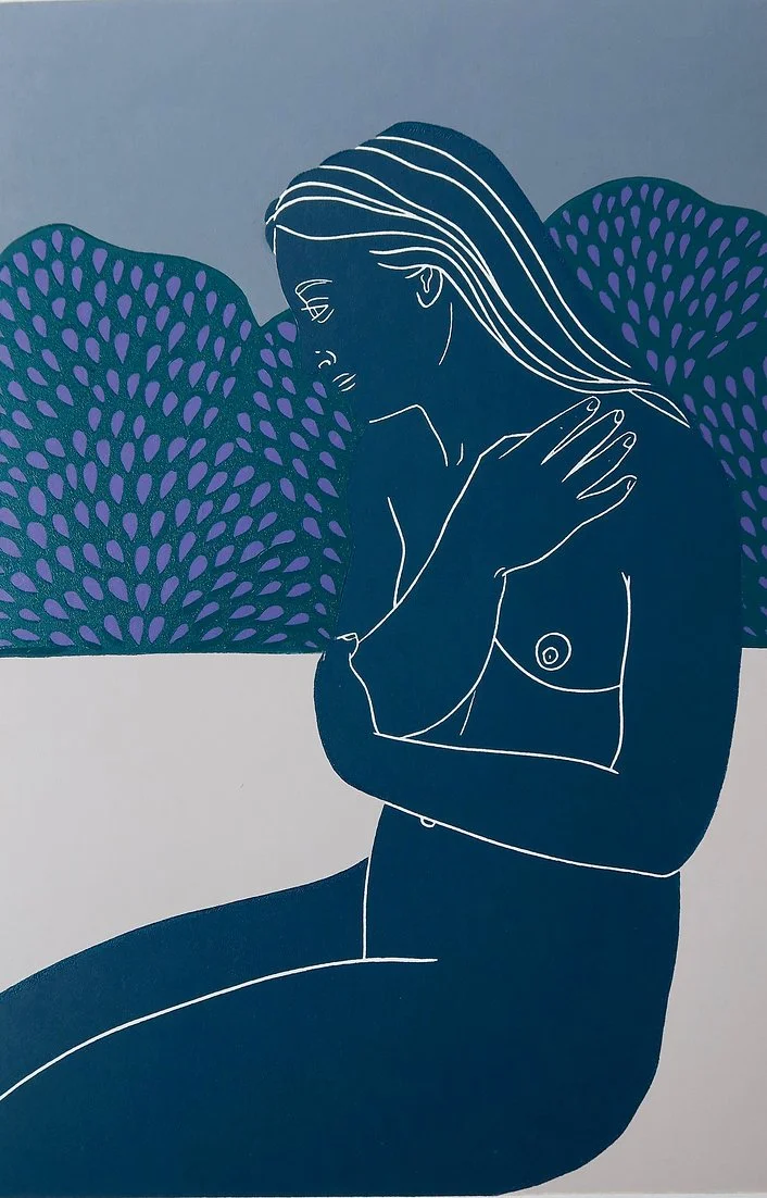 I’m a South London based printmaker and painter originally from Northern California. My primary interest is in cultivating a sense of home within myself, something that has eluded me for much of my life, and this is the exploration that I make in my work. I portray my own body in my images, though I don’t see my pieces as self-portraits. I hope to create works that are intimate, calming, and which connect to the space within the viewer that feels a similar longing.