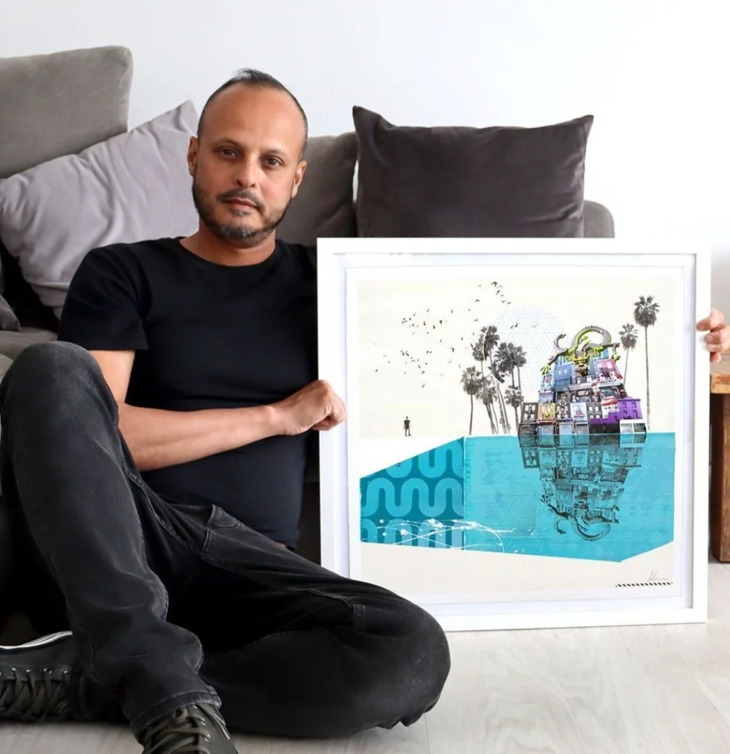 Anil Mistry is a UK based mixed media artist who focuses on creating fresh new interpretations of urban landscapes. Using source imagery from his travels around the world, Anil combines photography with mixed medias such as spray paints, stencils, acrylics and screen printing. These surreal and evocative collages feature stylistically unusual, misfit and often overlooked elements from cityscapes, environments and everyday objects. He playfully juxtaposes different elements to create rich new landscapes and settings - each with their own unique narrative.