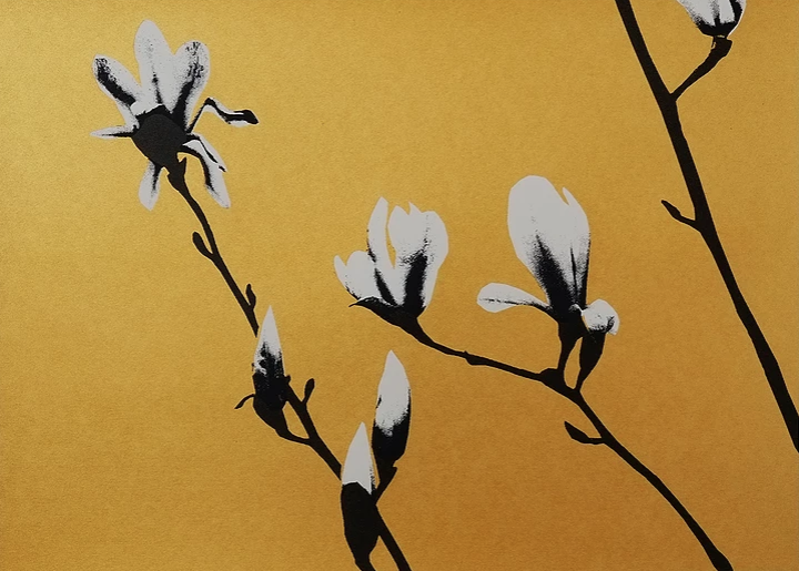 I love gold and for years I’ve been trying to find a gold paint I could print with which didn’t stick to the screen. I was very excited when I found one! So I have done a series of gold prints; ‘Where flowers bloom’, ‘Chinese Whispers’, ‘Spring Fever’. They are all inspired by nature, which influences me a lot in my work.